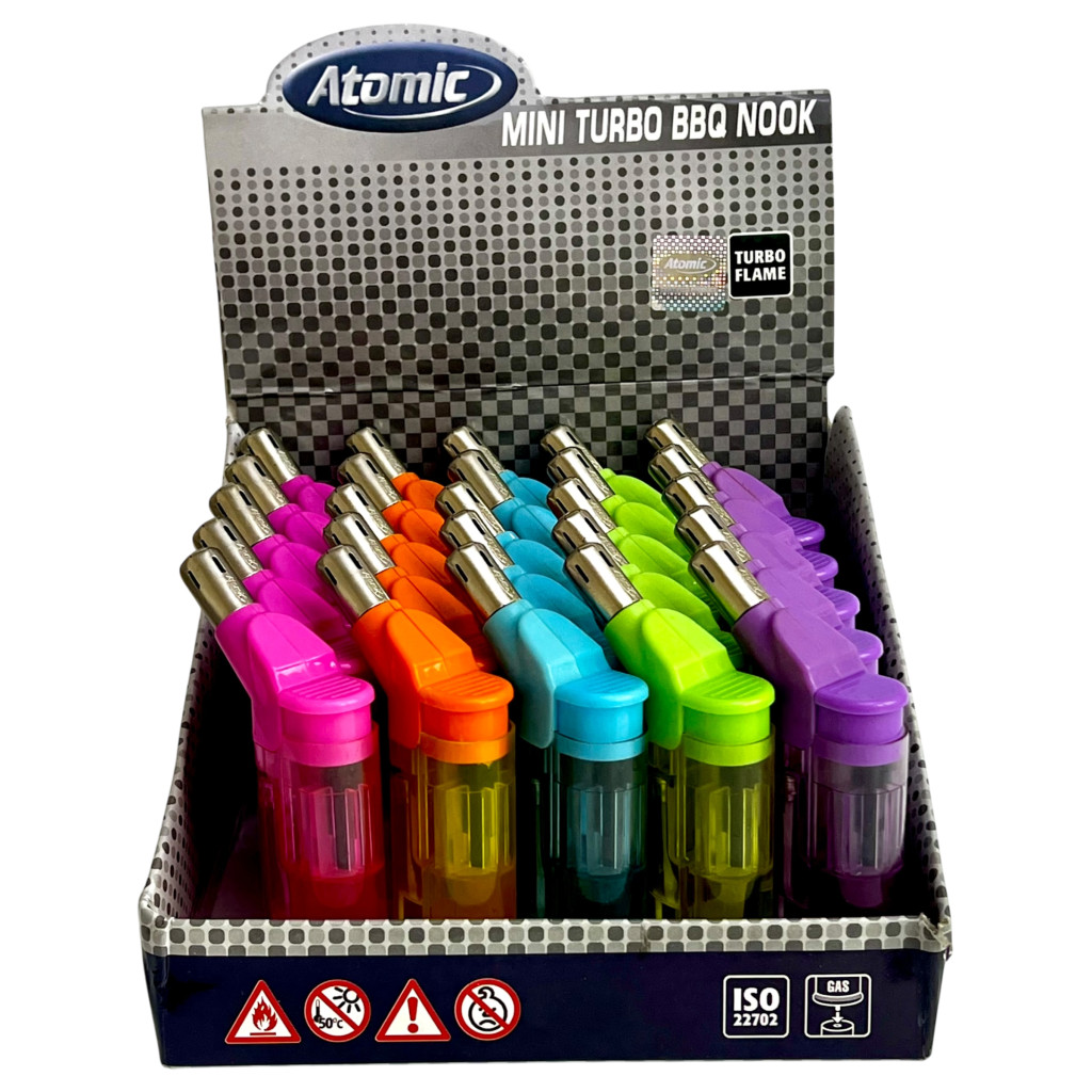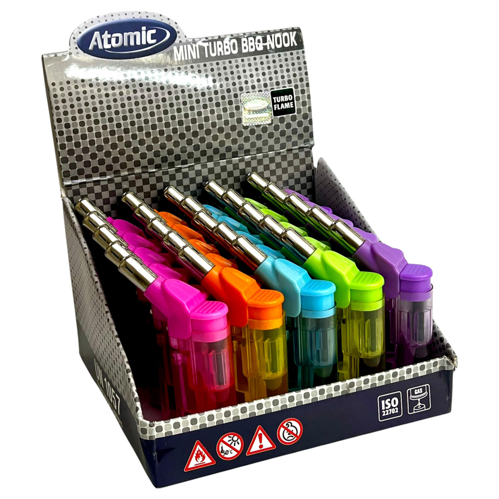 Atomic BBQ Nook Mini Turbo gázgyújtó az rfsmoke.hu kínálatában! Kompakt kialakítású fáklyagyújtó, amely extra erős, viharálló szúrólánggal rendelkezik. Az áttetsző, színes tartály praktikus gázszint-ellenőrzést tesz lehetővé. Ideális választás konyhai tűzhelyhez, vízipipához, vagy egyéb lifestyle kiegészítők használatához. Biztonsági zárral ellátott, 25 darabos kínáló display-ben, vegyes színekben érkezik.